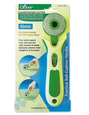 Clover's Soft Cushion Handle Rotary Cutters cut fabric beautifully with just the right amount of blade exposed, whether the cutter is held upright or at an angle. The cutter blade setup can be reversed making the rotary cutter suitable for both right and left handed operation