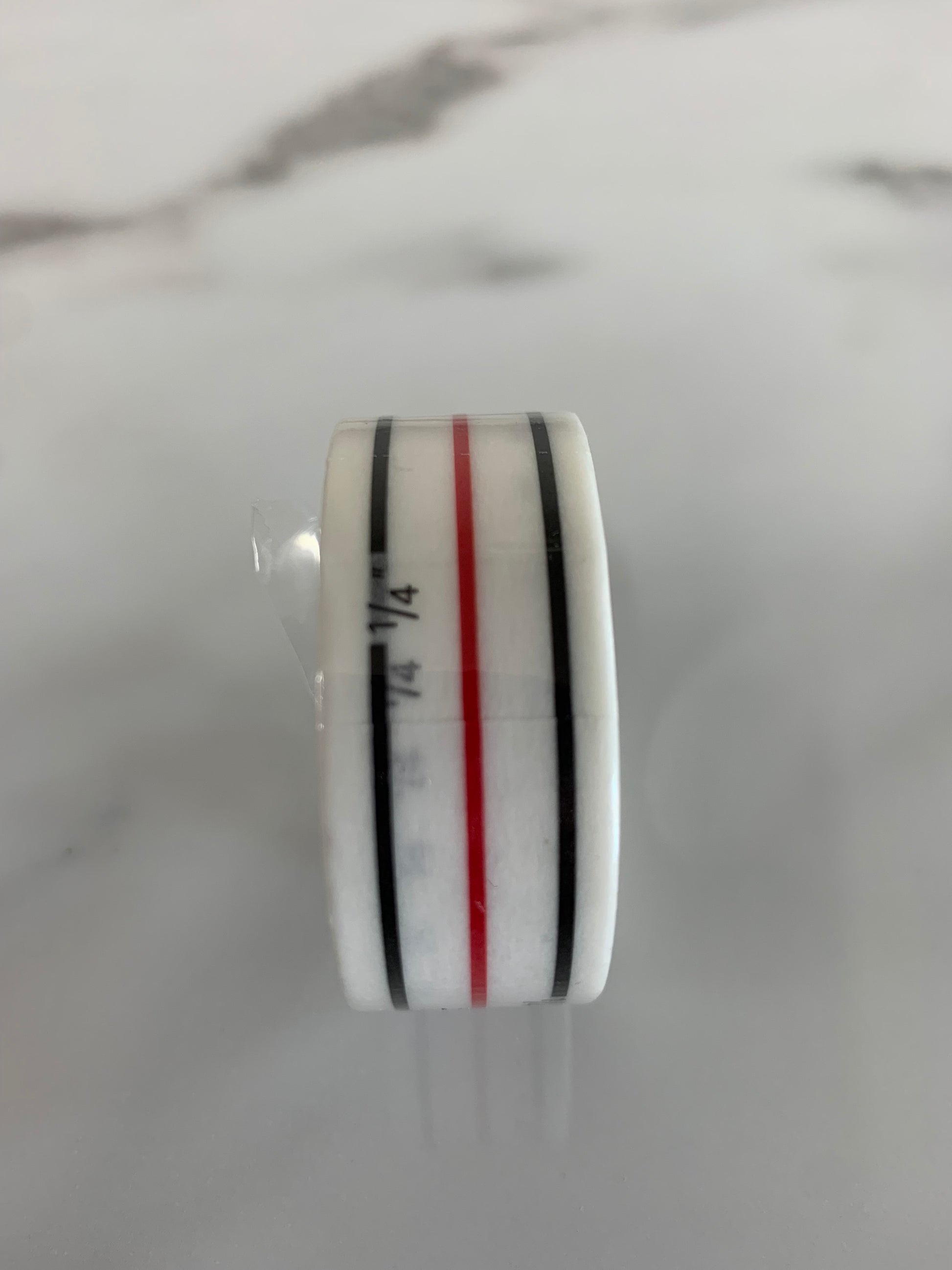 Simply place the tape in front of the feed dogs with the red line in front of the needle as the stitch line. The black lines on either side of the center line represent a perfect 1/4" seam allowance and are a great resource to use when making half square triangles, or learning to keep a perfect 1/4".