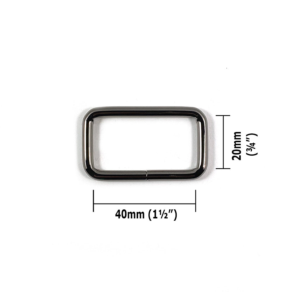 Wire-formed rectangle rings for use with 40mm (1-1/2″) wide bag straps and webbing.