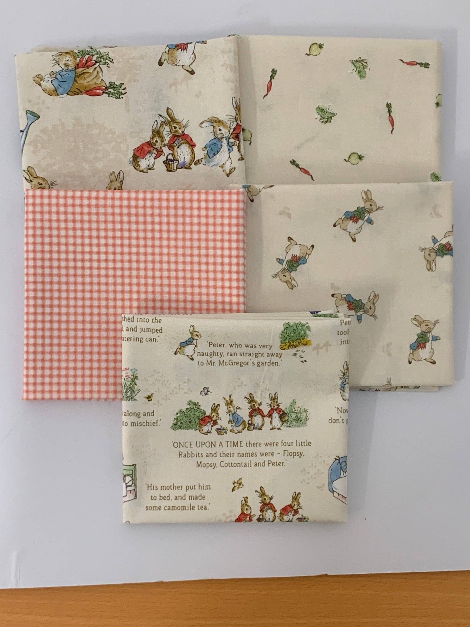 THIS ADORABLE BUNDLE OF 5 FAT 1/4'S, (EACH MEASURING 50CM X 56CM) FEATURING ALL THE DELIGHTFUL CHARACTERS FROM BEATRIX POTTER'S THE TALE OF PETER RABBIT.