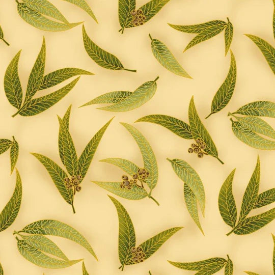 The leaves have been richly shaded and detailed, so you can pick up all the greens used in tonal coordinates in traditional prints like the Gumflower design in this collection, or even batiks or solids in varying shades of green. The design has a 30cm/12” repeat and the leaves out delicately outlined in gold.