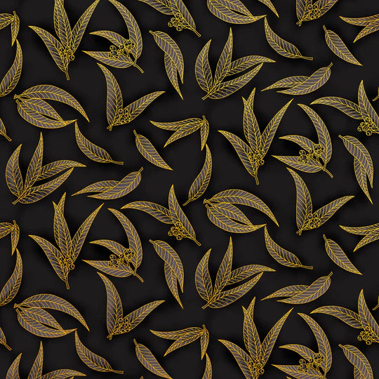 The leaves have been richly shaded and detailed, so you can pick up all the greens used in tonal coordinates in traditional prints like the Gumflower design in this collection, or even batiks or solids in varying shades of green. The design has a 30cm/12” repeat and the leaves out delicately outlined in gold.