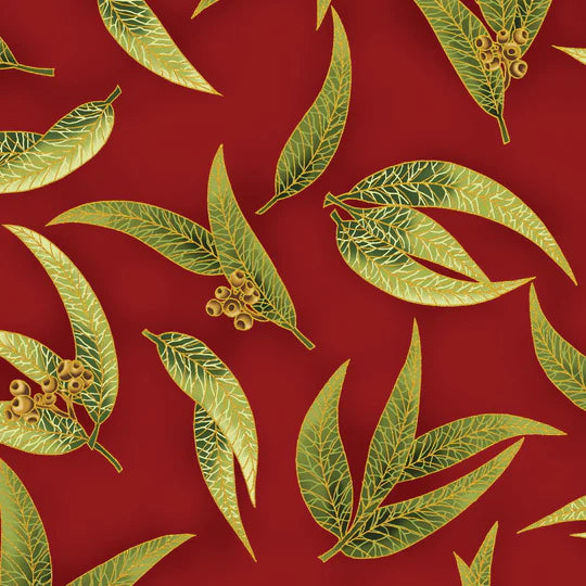 The leaves have been richly shaded and detailed, so you can pick up all the greens used in tonal coordinates in traditional prints like the Gumflower design in this collection, or even batiks or solids in varying shades of green. The design has a 30cm/12” repeat and the leaves out delicately outlined in gold.