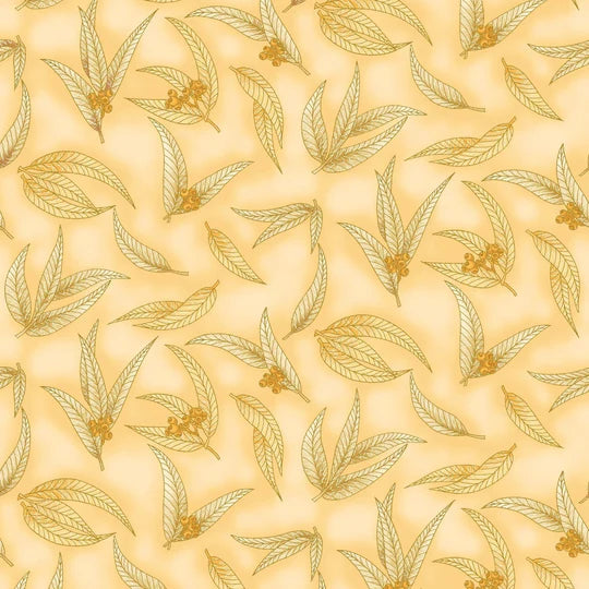 The leaves have been richly shaded and detailed, so you can pick up all the greens used in tonal coordinates in traditional prints like the Gumflower design in this collection, or even batiks or solids in varying shades of green. The design has a 30cm/12” repeat and the leaves out delicately outlined in gold.