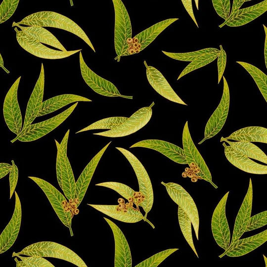 The leaves have been richly shaded and detailed, so you can pick up all the greens used in tonal coordinates in traditional prints like the Gumflower design in this collection, or even batiks or solids in varying shades of green. The design has a 30cm/12” repeat and the leaves out delicately outlined in gold.