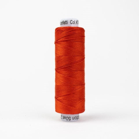 Konfetti is a 50wt, 3 ply double-gassed and mercerized Eqyptian cotton with a gorgeously soft, clean/ and lustrous finish. Free of any type of wax or coating that can cause build up in machines, this super low lint thread is a popular choice for quilting and long arming due to its quality finish and low bulk.